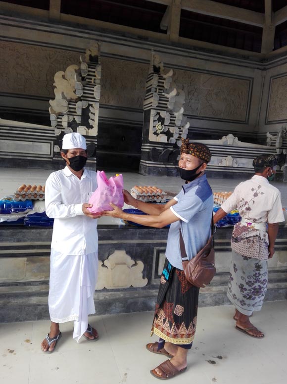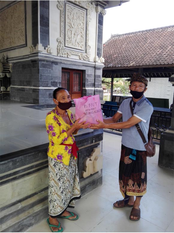Bandesa Desa Adat Guliang Kangin, Ngakan Putu Suarsana mehyerahkan Bantuan Pangan Non Tunai kepada Pinandita dan Serati Banten Desa Adat Guliang Kangin pada Rabu (27/05/2020) di Balai Desa Adat Guliang Kangin.